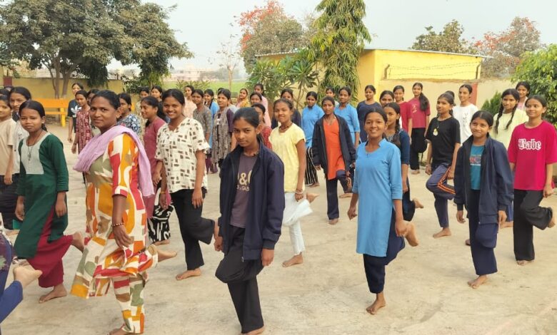 योग गुरु ने शरीर को फुर्तीला बनाने एवं एकाग्रता बढ़ाने के लिए कुंडली शक्ति विकासक क्रिया सिखाईं।विधि इस क्रिया को बीस से पच्चीस बार करें,एडी से नितम्बों पर तेज़ी से मारे।पैर बदल कर। फोटो छात्राएं कुण्डली शक्ति विकासक क्रिया करते हुए। इस अवसर पर अधिक्षिका श्रीमती मीरु खरडे उपस्थित थी। दर्ज संख्या 100 थीं।