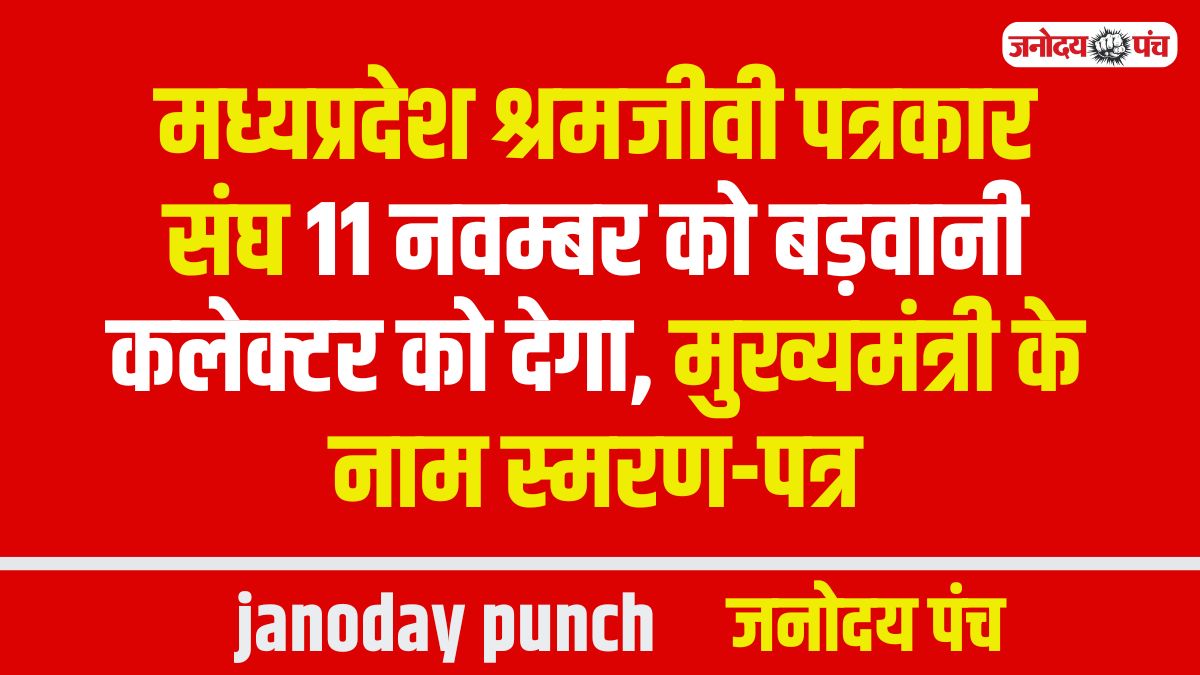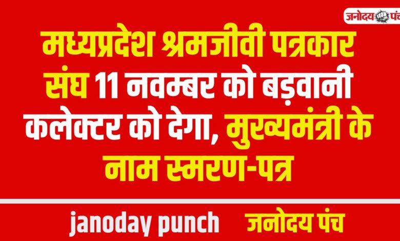 मध्यप्रदेश श्रमजीवी पत्रकार संघ 11 नवम्बर को बड़वानी कलेक्टर को देगा, मुख्यमंत्री के नाम स्मरण-पत्र