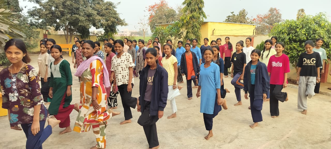 योग गुरु ने शरीर को फुर्तीला बनाने एवं एकाग्रता बढ़ाने के लिए कुंडली शक्ति विकासक क्रिया सिखाईं।विधि इस क्रिया को बीस से पच्चीस बार करें,एडी से नितम्बों पर तेज़ी से मारे।पैर बदल कर। फोटो छात्राएं कुण्डली शक्ति विकासक क्रिया करते हुए। इस अवसर पर अधिक्षिका श्रीमती मीरु खरडे उपस्थित थी। दर्ज संख्या 100 थीं।