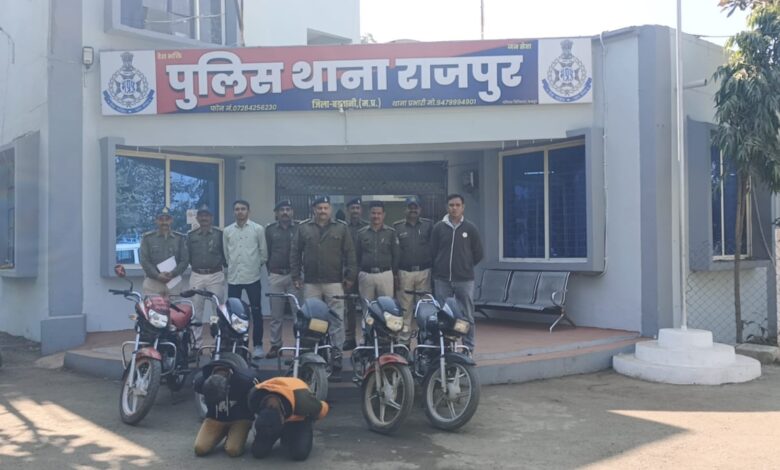 जनोदय पंच, राजपुर।लगातार हो रही मोटरसायकल चोरी की घटनाओं के बाद पुलिस ने कार्रवाई करते हुए दो आरोपियों को गिरफ्तार किया। जांच के दौरान चोरी की गई पांच मोटरसायकल बरामद की गईं। मामले में दर्ज अपराधों के आधार पर वैधानिक प्रक्रिया पूरी कर आरोपियों को न्यायालय में पेश किया गया।