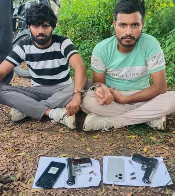 सेंधवा। रमन बोरखड़े। वरला पुलिस ने मुखबिर की सूचना पर सेंधवा रोड पर कार्रवाई करते हुए दो युवकों को हथियारों के साथ गिरफ्तार किया। आरोपियों से दो पिस्तौल और चार जिंदा कारतूस बरामद किए गए। पुलिस आरोपियों से पूछताछ कर रही है ताकि हथियारों की खरीद और उपयोग से जुड़े सुराग मिल सकें।