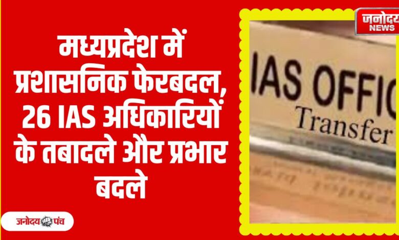 मध्यप्रदेश शासन ने 18 जनवरी 2026 को प्रशासनिक स्तर पर बड़ा फेरबदल करते हुए 26 आईएएस अधिकारियों के तबादले और अतिरिक्त प्रभार में बदलाव के आदेश जारी किए हैं। सामान्य प्रशासन विभाग द्वारा जारी आदेश के अनुसार सचिव, प्रमुख सचिव, आयुक्त और प्रबंध संचालक स्तर के अधिकारियों को विभिन्न विभागों में नई जिम्मेदारियां सौंपी गई हैं।
