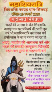 महाशिवरात्रि पर्व को लेकर नगर के सभी शिवालयों में भक्तों की भारी भीड़ उमड़ने की संभावना है। प्रशासन एवं मंदिर समितियों द्वारा श्रद्धालुओं की सुरक्षा और सुविधा को ध्यान में रखते हुए आवश्यक प्रबंध किए गए हैं। शिवभक्तों में पर्व को लेकर विशेष उत्साह देखा जा रहा है और पूरा नगर “हर हर महादेव” के जयघोष से गूंजने को तैयार है। सेंधवा से 5 किलोमीटर दूर स्थित शिव शक्तिधाम गोई वाकी शिवालय में पूजन उपरान्त साबूदाना खिचड़ी प्रसादी वितरण का आयोजन रखा गया है। ग्राम सिल्दड़ में भी भक्ति की आस्था के केंद्र शिवशक्ति नवग्रह धाम में प्रतिवर्ष की भांति इस वर्ष भी महाशिवरात्रि पर्व हर्षोल्लास के साथ मनाया जाएगा। श्रद्धालुओं के लिए साबूदाने की खिचड़ी व चाय की व्यवस्था संस्थापक द्वारा आयोजित की गई है।