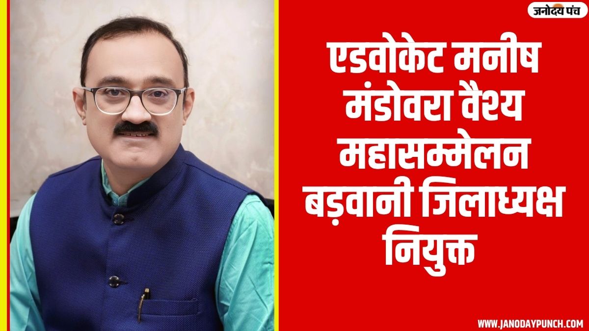 एडवोकेट मनीष मंडोवरा वैश्य महासम्मेलन मध्यप्रदेश के बड़वानी जिले के जिलाध्यक्ष नियुक्त