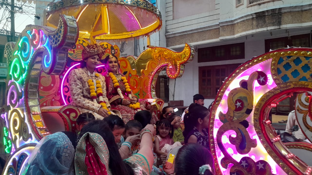बाने में एक सुसज्जित बग्घी विशेष आकर्षण का केंद्र रही। बग्घी में दुल्हन के रूप में पूनम शर्मा और दुल्हा के रूप में गायत्री शर्मा सजी हुई थीं। पूरे आयोजन में पारंपरिक सजावट ने वातावरण को उत्सवमय बनाया।