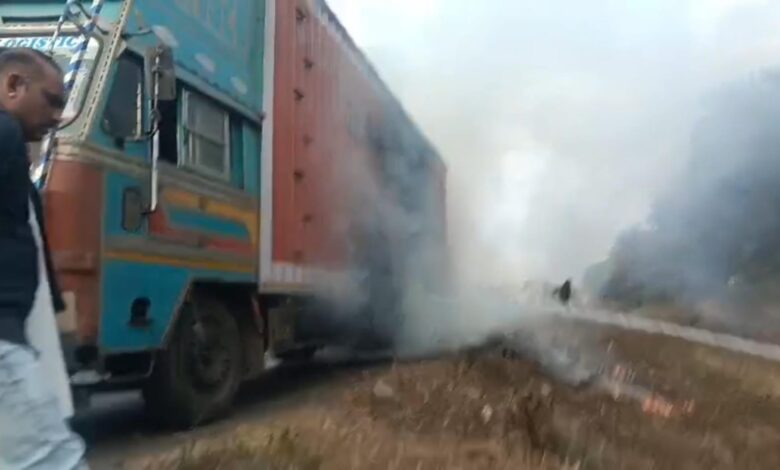 सेंधवा में मुंबई-आगरा हाईवे पर कंटेनर-बाइक की टक्कर, कंटेनर में लगी आग