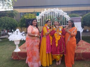 उत्सव के दौरान राधा-कृष्ण स्वरूप में सांस्कृतिक प्रस्तुति दी गई, जिसने सभी का ध्यान आकर्षित किया। राधा की भूमिका रुचिका कोठारी ने निभाई, जबकि कृष्ण के रूप में रीना गर्ग ने प्रस्तुति दी। दोनों की भावपूर्ण अभिव्यक्ति और पारंपरिक परिधान ने कार्यक्रम में विशेष आकर्षण जोड़ा।